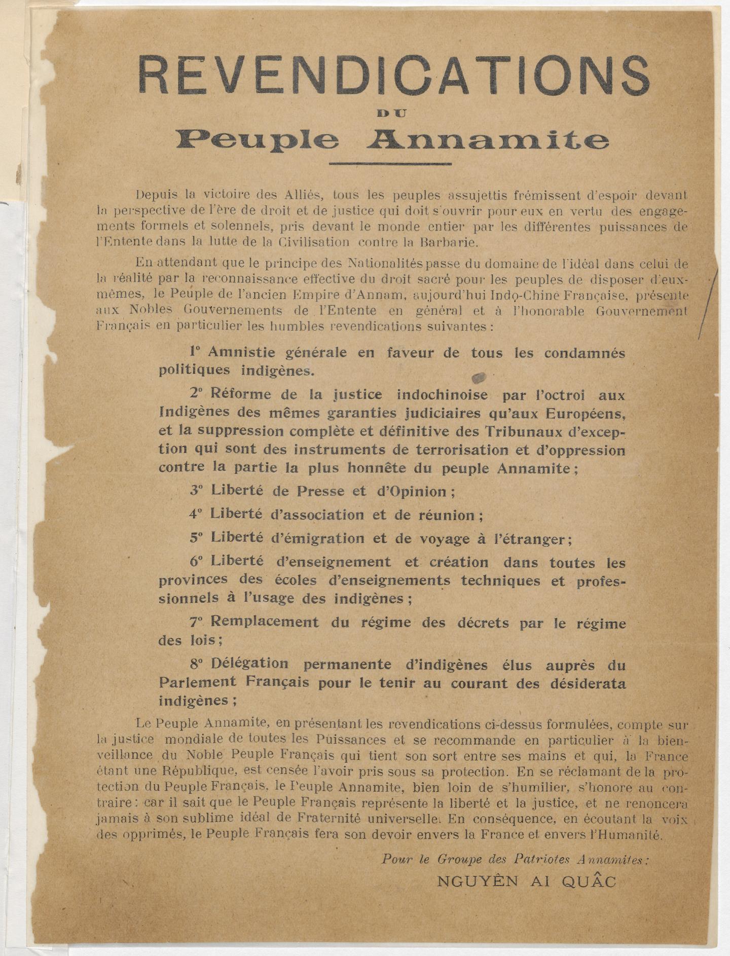 Historians have treated Ho’s alleged penning of the “Demands of the Annamite People” as the birth hour of modern Vietnamese nationalism, but have rarely paused to consider the local context in which the leaflet emerged. In spite of two decades of pleas to examine how the global manifests itself in the local and vice versa, documents such as this one are the mainstay of the intellectual and political histories of nationalism in the countries of the global south, yet their protagonists all too often appear aloof from the social world surrounding them. Attention to this local context can tell us a great deal about the global spread of nationalism in the twentieth century.