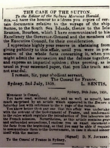 For the full story, see: Karin Speedy, “The Sutton Case: the First Franco-Australian Foray into Blackbirding,” Journal of Pacific History 50, no. 3 (2015), 344-364.