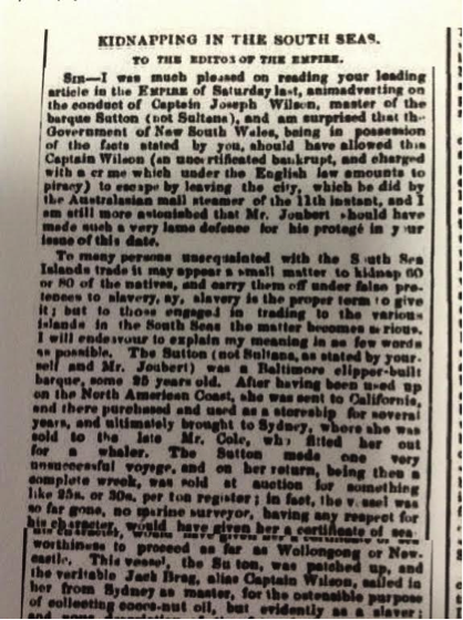 Meanwhile, in Sydney, on 26 June 1858, the liberal daily newspaper the Empire broke the news of the alleged slave trading. It named Wilson and Joubert as the scoundrels behind the abduction of 65 Pacific Islanders.