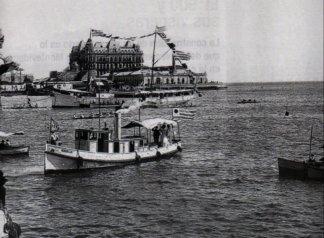 Races organized by the Montevideo Rowing Club in Montevideo Bay, c. 1890. The Hotel Nacional, in the background, was one of the greatest schemes of the National Company of Credit and Public Works. Victim of the 1890 crisis, the building was never operational, and the French manager stayed some years in the empty hotel waiting for an inauguration that never happened.