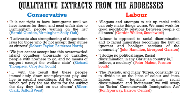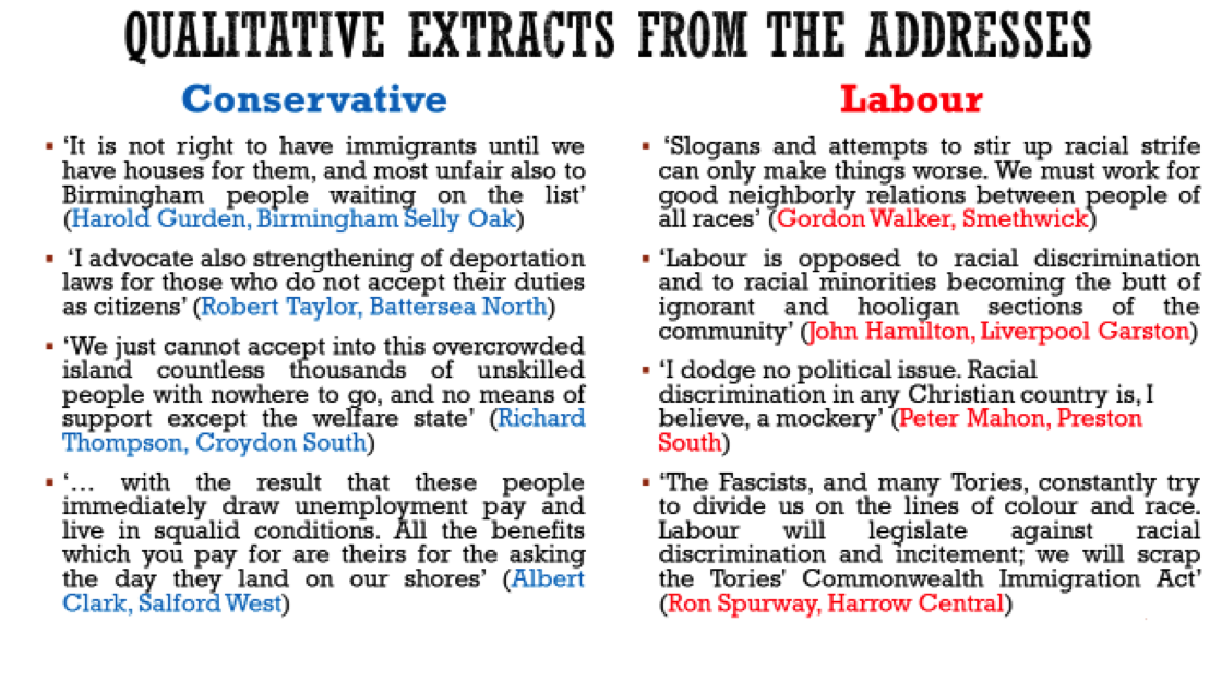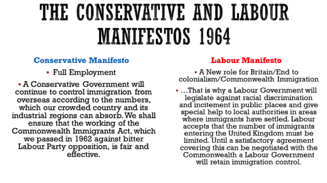 It fast became clear that there were marked differences in the way in which each party was thinking about immigration – Conservatives focused on control, whereas Labour highlighted the need to prevent racial discrimination. The brief period of consensus ended in 1964.