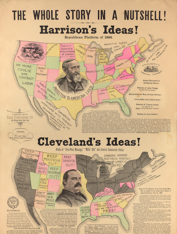 ‘The Whole Story in a Nutshell!’ (1888) – Here’s one of my favorites for a lot of reasons. To give it some context, the so-called Great Debate of 1888 (that year’s presidential election) was centered around the future of US trade policy. The GOP was staunchly protectionist and Anglophobic at this time, and they feared the perceived influence of ‘Free Trade England’ on US politics. British free traders (in particular London’s Cobden Club, featured on the bottom left), were the main targets of paranoid Republican protectionist propaganda. Democratic President Grover Cleveland only added to the conspiracy theories when he filled his cabinet and advisors with US members of the Cobden Club. The pro-Harrison map does a vivid job of illustrating the GOP’s economic nationalism in contrast to Democratic free trade. For more on this, my book, The ‘Conspiracy’ of Free Trade, explores the conspiratorial reception of British free-trade ideas in Gilded Age America.