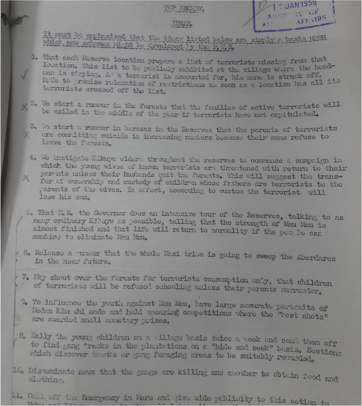 An archival document detailed ‘brain-storming’ sessions amongst the colonial government’s ‘Psychological Warfare Staff’, where methods to distort the Kenyan public’s perception and thought up, as well as ways to entice the Kikuyu population to reveal the whereabouts of Mau Mau fugitives.