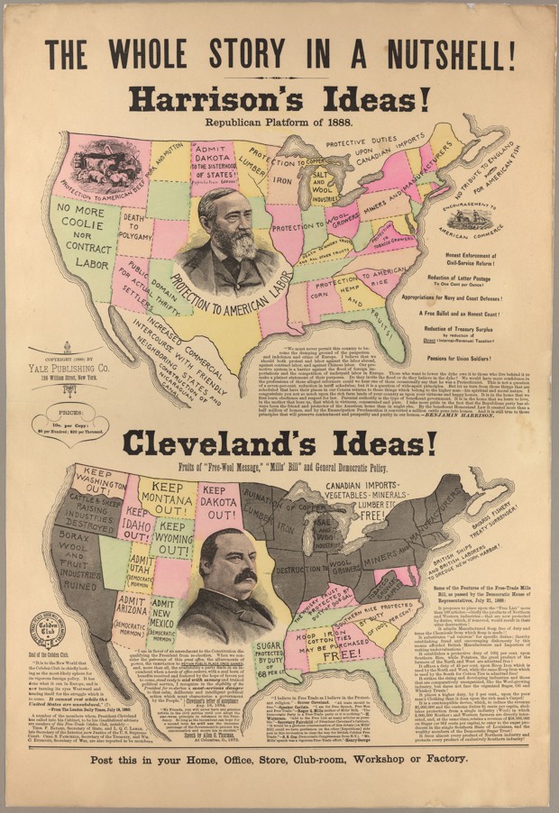 Maps meant to characterize the trade policies of Benjamin Harrison and Grover Cleveland in the 1888 election. (Courtesy of Cornell University—PJ Mode Collection of Persuasive Cartography)