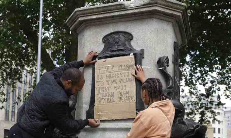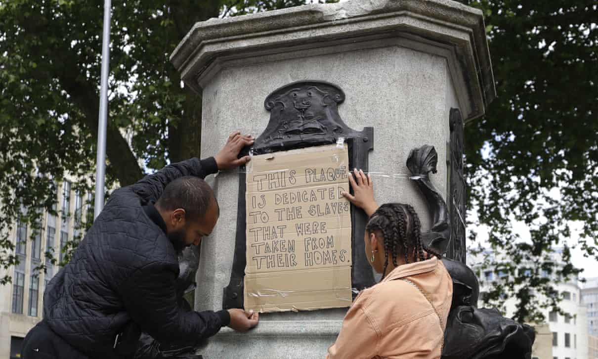 ‘This Plaque Is Dedicated to the Slaves That Were Taken From Their Homes.’ Banner taped to the pedestal of the toppled statue of Edward Colston, Bristol, UK. Photograph: Kirsty Wigglesworth/AP