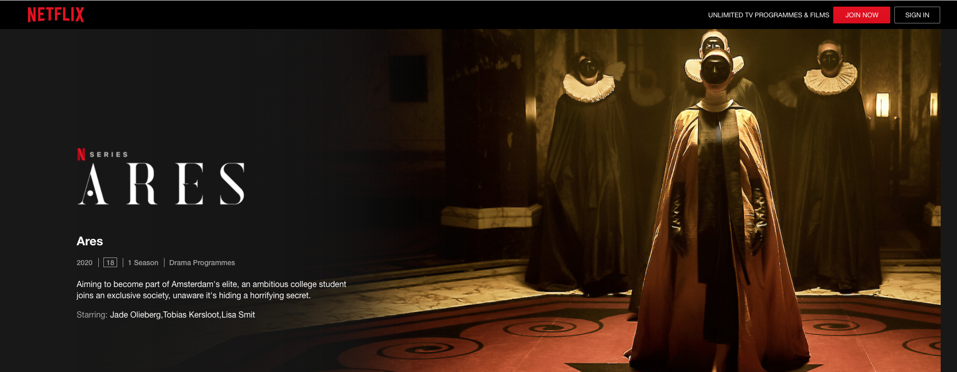 In 2020 Netflix produced Ares (directors Giancarlo Sanchez & Michiel ten Horn), its first Dutch horror series. The eight episodes in the series deal with the story of Rosa (Jade Olieberg), an Amsterdam university student of mixed ethnicity and working-class/lower middle-class background, who is invited to join a wealthy and powerful secret society called Ares. Apart from Rosa the other members of Ares appear entirely European and extremely rich and well-connected.