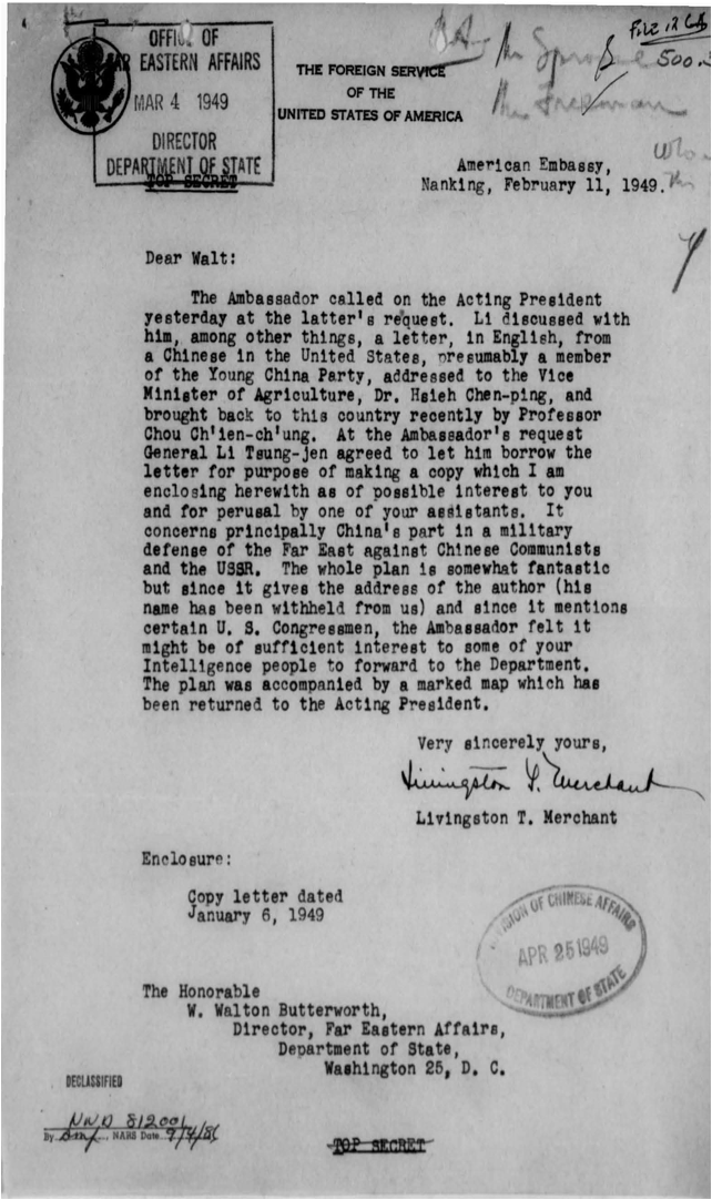 The type of ‘vast and delicate enterprise’ that such ‘indigenous’ actors had to pursue through ‘clandestine channels’ was outlined in a letter to Walton Butterworth, director of the Office of Far Eastern Affairs at the State Department and dated 11 February 1949, that introduced ‘Operation Belly’. The operation – whose ‘working terms’ were discussed with prominent Democratic senators ‘very very close to Truman’ – foresaw a ‘defense-for-democracy’ encirclement strategy on ‘the eastern front vis-à-vis Soviet Russia’. In relation to China, the plan explained that Taiwan had to be used for ‘ground force training and naval installations’; and it pointed out that the ‘provinces of Kwangtung, Hunan, Fukien, southern Kiangsi, Kweichow, Yunan, Szechuan, southern Shensi, Kansu, Ningxia, Chinghai, Western Suiyuan, and eventually Sinkiang will form the mainland of the Asiatic belly’.