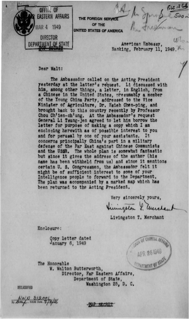 By adopting this policy statement, the United States officially committed not to support Chiang Kai-Shek’s nationalist Kuomintang government—which was firm in its request for unlimited additional economic and military aid; however, it remained open to alternative and more effective options. In particular, the final and concluding policy recommendation of NSC 34/2 (paragraph 18 – officially still ‘not printed’ on FRUS) declared that the American ‘principal reliance in combating Kremlin influence in China should, however, be on the activities of indigenous Chinese elements. Because we bear the incubus of interventionists, our official interest in any support of these elements, a vast and delicate enterprise, should not be apparent and should be implemented through appropriate clandestine channels’.