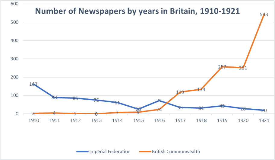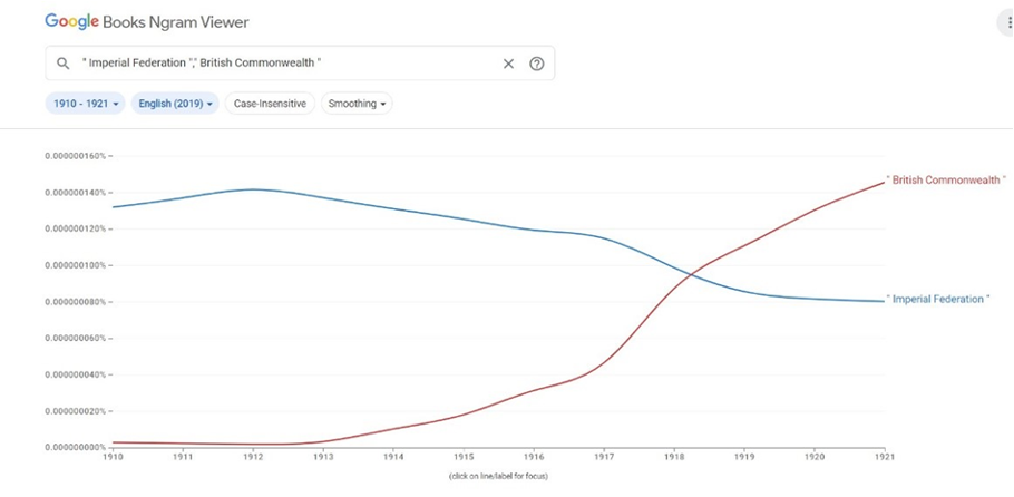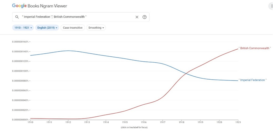 An analysis of newspapers from 1910 to 1921, conducted using the Gale Primary Sources database, reveals that the term “British Commonwealth” was rarely used in the context of the empire before 1916. In contrast, the term “Imperial Federation” saw a marked decline in usage after 1910, showing an inverse relationship with the rise of “British Commonwealth.” This trend is clearly observable in both the Gale Primary Sources database and Google Books Ngram.