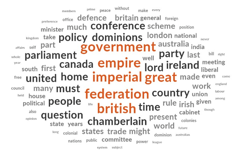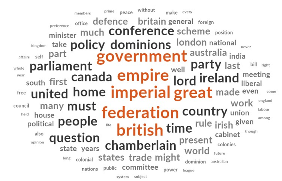 A word frequency analysis from 1910 to 1921 reveals that the terms “imperial parliament,” “Dominions,” and “Ireland” appeared frequently during this period. This suggests that the decline in the rhetoric of Imperial Federation was largely driven by opposition from the Dominions and Ireland to the concept of an “imperial parliament”.