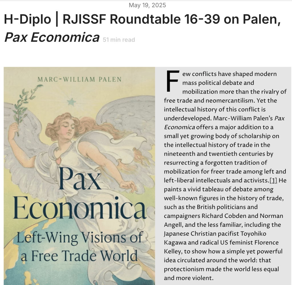 Martin Conwayagrees that Palen’s work forces us to rethink assumptions about free trade ideas serving simply as a cloak for narrow economic or geopolitical interests, or as a “lost cause espoused by a fringe of naïve liberal groups.”At the same time, Conway also points to the challenges faced by globally-focused intellectual histories. He notes that as much as showing what united otherwise very different writers, it is equally important to consider the specific and context-bound nature of their political aims. The dissemination of free trade ideas, as Palen’s book shows, was itself driven by “Western globalization.” But these ideas took on lives of their own as they intersected with an array of political causes—from Indian independence to Chinese Nationalism to interwar US feminism.