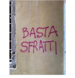 Take, for example, signs like “Do Not Touch” posted at local market stalls, clearly aimed at tourists, or graffiti such as “Tourists Go Home” and “Basta Sfratti” (Stop Evictions) scrawled near real estate listings. These signs don’t just communicate practical messages; they express deeper anxieties about space ownership, access, and identity.