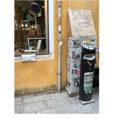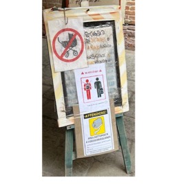 Figure 6 & 7, on the other hand, show an interaction between Italian and English signs, usually as an indication of the intended target audience. The signs near this bookshop are particularly interesting because the spatial overlay of certain signs can teach us more about the chronological evolutions of the multilingual aspect of the signs and the perceived hierarchy of languages here. The fully written out signs (warning to watch out for the cats if you brought your dog, and an instruction to be careful not to swing your backpack into something) have both evolved from bilingual to monolingual signs. As we can safely assume that tourists are less likely to have brought their pets compared to locals, it makes sense that the English part of Figure 3 has faded and/or been wiped out over time, without it majorly impacting the effectiveness of the sign. Contrarily, the other instruction has been re-imagined as a less complex, solely English sign. We could interpret this to mean that locals usually do not carry big backpacks, and that tourists are more likely to recklessly stumble into things in the shop. Moreover, most of the signs have been simplified and turned into non-verbal ones by working with pictograms. This could either be a way to avoid tourists not reading the fully written out signs, or a way to circumvent having to choose a specific language.