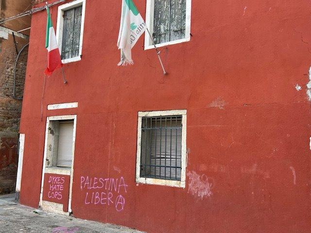 We spotted the local headquarters of a political party, a shaded space beneath which children played while grandparents and parents watched over them—a scene that speaks to a slower, everyday rhythm of life. On the walls of the party’s building, we noticed various forms of political and social contestation, some of them written in Italian. These signs suggest ongoing civic engagement and resistance—messages clearly intended for a local audience, rather than passing tourists. “Palestina Libera” (Free Palestine), in Italian, next to “Dykes Hate Cops” in English, as well as “Queers for Palestine”. One of our unanswered question concerns precisely the multilingualism displayed in these graffiti: given the style and colour, they are apparently made by the same people. Is the English language used because of international movements and political slogans, or is it like that strategically to reach as many people? After all, the English slogans have their corresponding Italian version.