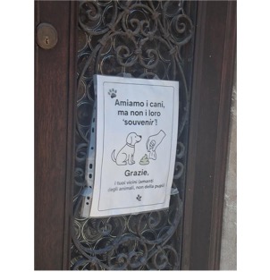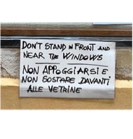 The shop right next to the bookshop naturally has to deal with a lot of indirect tourism, which is evidenced by the bilingual sign/instruction (Figure 8) attached to the windows. While the sign is written out in Italian and English, the choice to put English first could indicate that this is mostly meant as an instruction for tourists. However, as Figure 6 shows, the abundance of stickers and notes on the electricity box right next to the window suggest that the warning has often gone ignored.