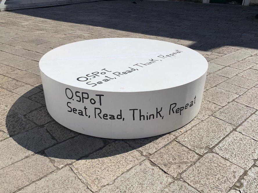 Yet, as one approaches the library, it is not the flow of residents or the prominent Italian signage that commands attention. Instead, the eye is drawn to a trio of large lion statues dominating the space adjacent to the entrance. Two white circular benches stand in front of them, bearing a message not in Italian, but in English: “Seat, Read, Think, Repeat.”