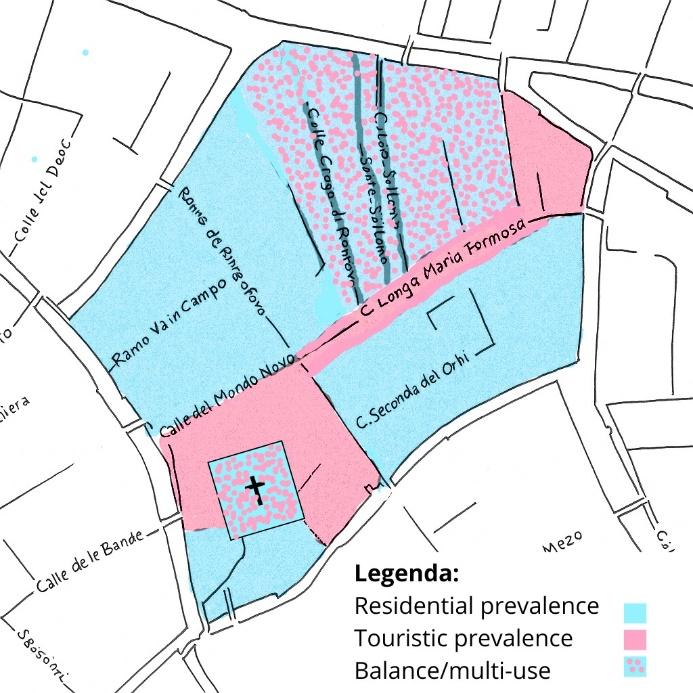 What emerged was a relatively clear—but not rigid—division of urban zones. Certain parts of the campo leaned toward residential use, marked by local services, political party headquarters, and spaces where children played and elderly residents gathered. Other areas skewed toward tourism, featuring souvenir stands, signage in multiple languages, and art installations repurposed as photo ops. Despite this spatial division, we also observed polyfunctional spaces, such as churches used simultaneously for worship and sightseeing, with signage reflecting their dual roles in multiple languages and registers.