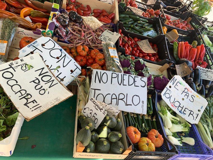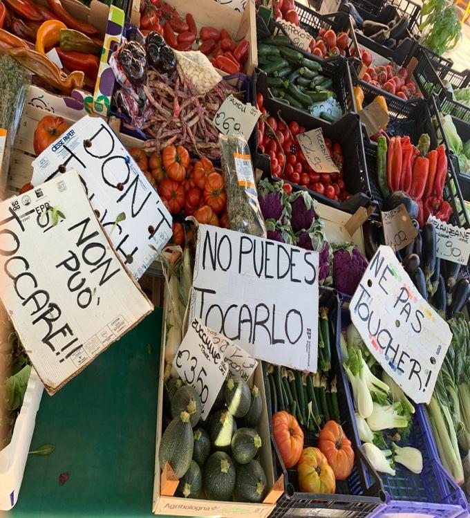 But a closer look complicates this cheerful image. The signs displayed on the stall read “Do not touch”—and are all in different languages. These multilingual signs instantly disrupt the assumption that the stall serves primarily local residents. Would Venetians really need to be reminded not to touch the products for sale?